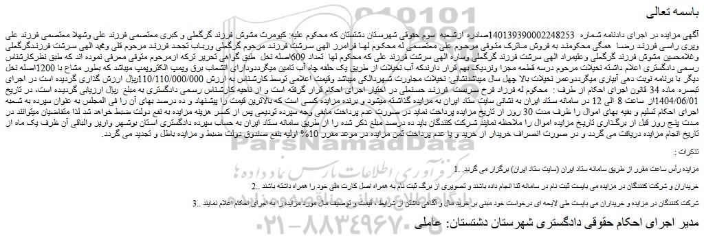 آگهی مزایده در اجرای دادنامه شماره  140139390002248253صادره ازشعبه  سوم حقوقی شهرستان دشتستان که محکوم علیه: کیومرث مشوش فرزند گرگعلی و کبری معتصمی فرزند علی وشهلا معتصمی فرزند علی وپری راسی فرزند رضا  همگی محکومند به فروش ماترک متوفی مرحوم علی معتصمی له محکوم لها فرامرز الهی سرشت فرزند مرحوم گرگعلی ورباب تجحد فرزند مرحوم قلی ومحمد الهی سرشت فرزندگرگعلی وغلامحسین مشوش فرزند گرگعلی وعلیمراد الهی سرشت فرزند گرگعلی وساره الهی سرشت فرزند علی که محکوم لها  تعداد 609اصله نخل  طبق گواهی تحریر ترکه ازمرحوم متوفی معرفی نموده اند که طبق نظرکارشناس رسمی دادگستری اعلام داشته نخیلات مرحوم درسه قطعه مجزا ونزدیک بهم قرار دارندکه آب نخیلات از طریق یک حلقه چاه آب تامین میگرددودارای انشعاب برق وپمپ الکتروپمپ میباشد که بطور مشاع با 1200اصله نخل دیگر با برنامه نوبت دهی آبیاری میگرددوعمر نخیلات بالا چهل سال میباشدنشانی: نخیلات مجاورت شهردالکی میباشد وقیمت اعلامی توسط کارشناس به ارزش 110/110/000/000ریال ارزش گذاری گردیده است در اجرای تبصره ماده 34 قانون اجرای احکام از طرف :  محکوم له فرزاد فرخ سربست  فرزند حسنعلی در اختیار اجرای احکام قرار گرفته است و از ناحیه کارشناس رسمی دادگستری به مبلغ  ریال ارزیابی گردیده است، در تاریخ 1404/06/01از ساعت 8 الی 12 در سامانه ستاد ایران به نشانی سایت ستاد ایران به مزایده گذاشته میشود و برنده مزایده کسی است که بالاترین قیمت را پیشنهاد و ده درصد بهای آن را فی المجلس به عنوان سپرده به شعبه اجرای احکام تسلیم و بقیه بهای اموال را ظرف مدت 30 روز از تاریخ مزایده پرداخت نماید در صورت عدم پرداخت مابقی وجه سپرده تودیعی پس از کسر هزینه مزایده به نفع دولت ضبط خواهد شد لذا متقاضیان میتوانند در مدت پنج روز قبل از برگذاری تاریخ مزایده اموال را ملاحظه نمایند شرکت کنندگان باید ده درصد مبلغ ذکر شده را از طریق سامانه ستاد ایران به حساب سپرده دادگستری استان بوشهر واریز والباقی آن ظرف یک ماه از تاریخ انجام مزایده دریافت می گردد و در صورت انصراف خریدار از خرید و یا عدم پرداخت ثمن مزایده در موعد مقرر 10% اولیه بنفع صندوق دولت ضبط و مزایده باطل و تجدید می گردد.