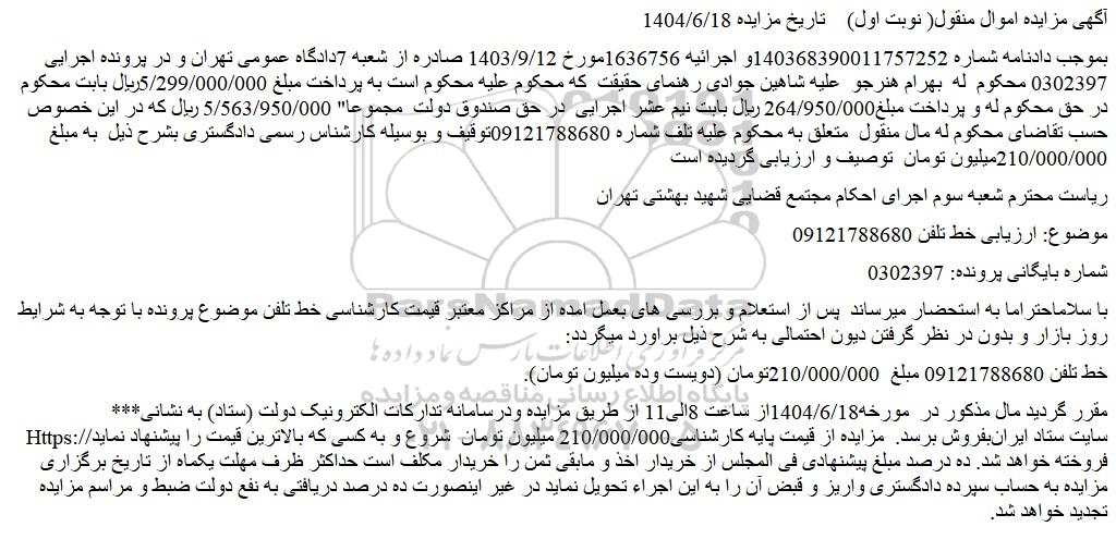بموجب دادنامه شماره 140368390011757252و اجرائیه 1636756مورخ 1403/9/12 صادره از شعبه 7دادگاه عمومی تهران و در پرونده اجرایی 0302397 محکوم  له  بهرام هنرجو  علیه شاهین جوادی رهنمای حقیقت  که محکوم علیه محکوم است به پرداخت مبلغ 5/299/000/000ریال بابت محکوم در حق محکوم له و پرداخت مبلغ264/950/000 ریال بابت نیم عشر اجرایی  در حق صندوق دولت  مجموعا" 5/563/950/000 ریال که در این خصوص حسب تقاضای محکوم له مال منقول  متعلق به محکوم علیه تلف شماره 09121788680توقیف و بوسیله کارشناس رسمی دادگستری بشرح ذیل  به مبلغ 210/000/000میلیون تومان  توصیف و ارزیابی گردیده است