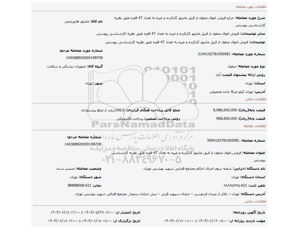 | عنوان معامله: فروش اموال منقول از قبیل مانیتور کارکرده و غیره به تعداد 47 ققره طبق نظریه کارشناسی پیوستی | ||