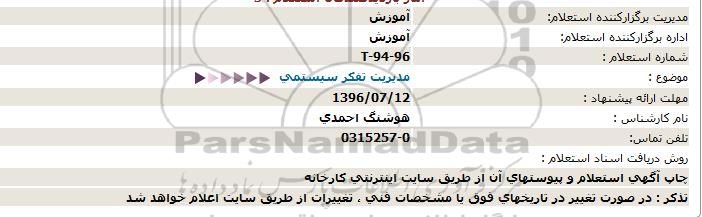 استعلام بها و موضوع استعلام استعلام، استعلام مدیریت تفکر سیستمی به اطلاع کلیه شرکتها و افراد متخصص واجد شرایط میرساند، آگهی گذار در نظر دارد از طریق استعلام بها، نسبت به انتخاب و دریافت پیشنهادات اقدام نماید. این استعلام با کد آگهی ثبت شده در سامانه خبرگزاری پارس نماد : 944077 منتشر شده است. مشخصات استعلام : تاریخ شروع استعلام: 1396/07/06 آخرین مهلت ارسال پیشنهاد قیمت : 1396/07/12 و محل اجرای پروژه : استان اصفهان میباشد. استعلام قیمت مورد درخواست : استعلام، استعلام مدیریت تفکر سیستمی با دستهبندیهای تخصصی و گروه های مرتبط : مشاوره تحقیقات و مدیریت استاندارد, استعلام اطلاع رسانی میگردد.