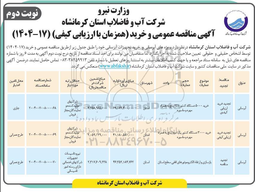 شرکت آب و فاضلاب استان کرمانشاه در نظر دارد پروژه های آبرسانی و خرید تجهیزات آبرسانی خود را طبق جدول زیر از طریق مناقصه عمومی و خرید (17-1404) توسط اشخاص حقیقی و حقوقی تعیین صلاحیت شده به اجرا بگذارد. لذا متقاضیان میتوانند برای اخذ اسناد مناقصه از تاریخ درج نوبت دوم آگهی به مدت 6 روز با شماره مناقصه های ذیل به سامانه ستاد مراجعه و یا جهت کسب اطلاعات بیشتر به استثنا روزهای تعطیل با شماره تلفن 38259913-083 تماس حاصل نمایند. در ضمن آگهی مذکور در سایت ملی مناقصات کشور و سایت شرکت آب و فاضلاب استان کرمانشاه (www.abfakshir) منعکس می گردد.