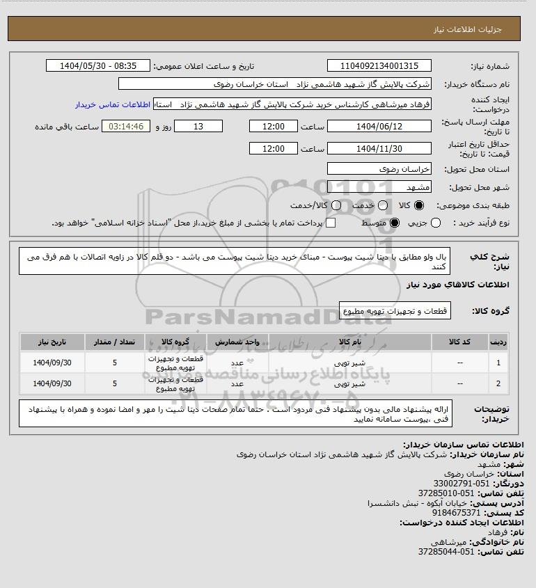 نام دستگاه خریدار:شرکت پالایش گاز شهید هاشمی نژاد استان خراسان رضوی