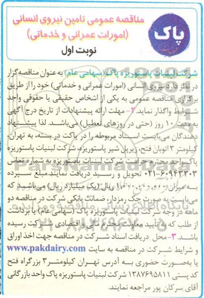 شرکت لبنیات پاستوریزه پاک (سهامی عام) به عنوان مناقصه گزار در نظر دارد نیروی انسانی امورات عمرانی و خدماتی خود را از طریق برگزاری مناقصه عمومی به یکی از اشخاص حقیقی یا حقوقی واجد شرایط واگذار نماید.