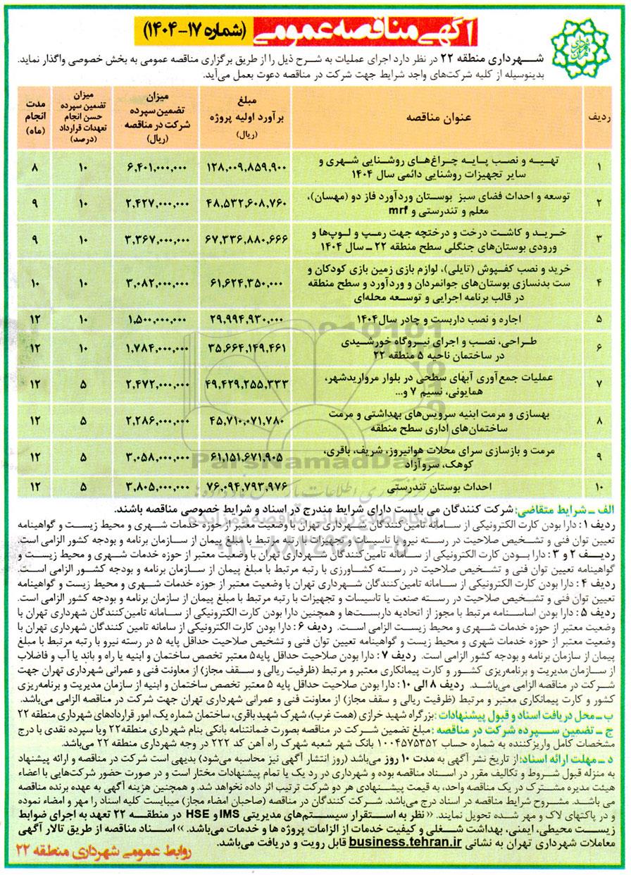 | 3 | خرید و کاشت درخت و درختچه جهت رمپ و لوپ ها و ورودی بوستان های جنگلی سطح منطقه 22- سال 1404 | 67.336.880.666 | 3.367.000.000 | 10 | 9 |