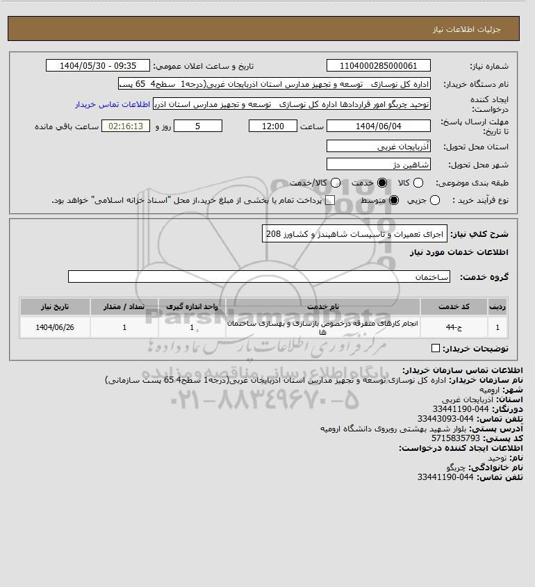 شرح کلی نیاز: اجرای تعمیرات و تاسیسات شاهیندژ و کشاورز 208