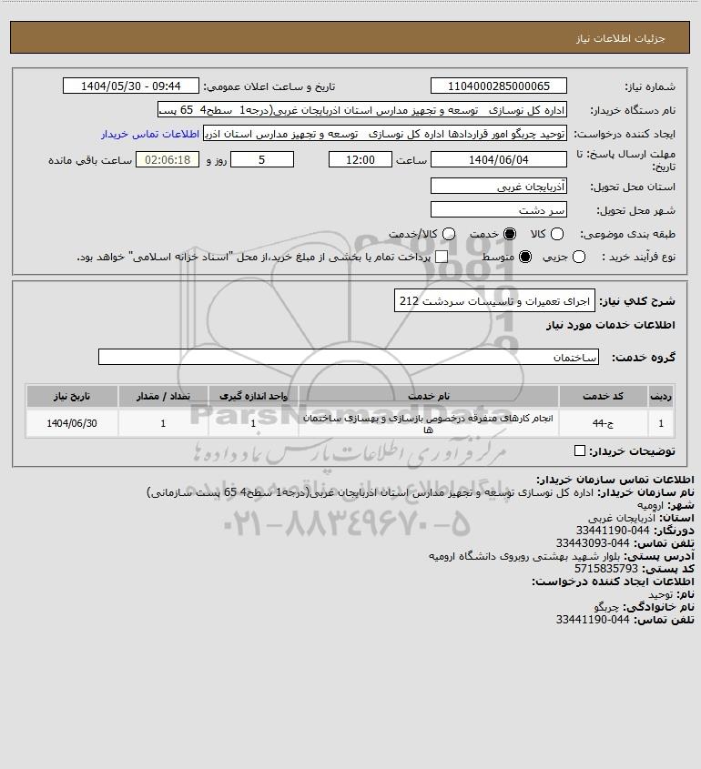 شرح کلی نیاز: اجرای تعمیرات و تاسیسات سردشت 212