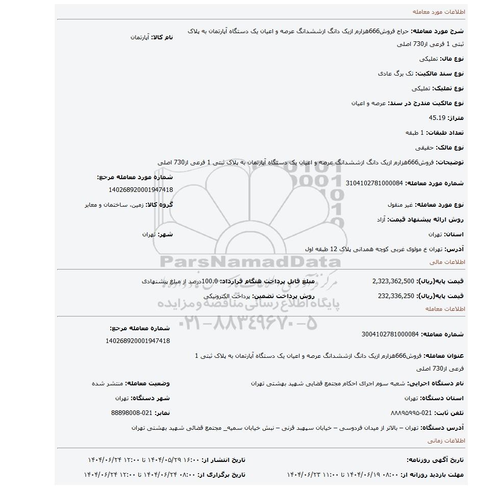 | شرح مورد معامله: حراج فروش666هزارم ازیک دانگ ازششدانگ عرصه و اعیان یک دستگاه آپارتمان به پلاک ثبتی 1 فرعی از730 اصلی | نام کالا: آپارتمان | |