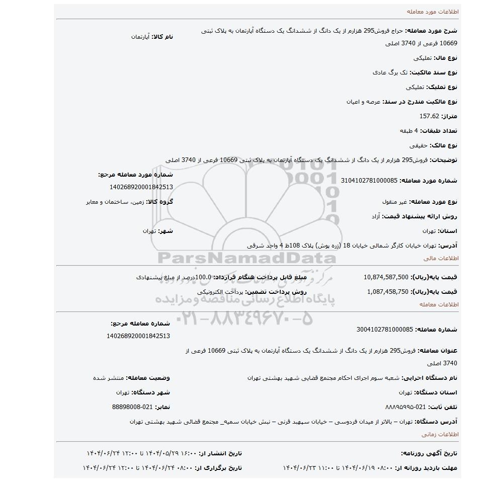 | شرح مورد معامله: حراج فروش295 هزارم از یک دانگ از ششدانگ یک دستگاه آپارتمان به پلاک ثبتی 10669 فرعی از 3740 اصلی | نام کالا: آپارتمان | |