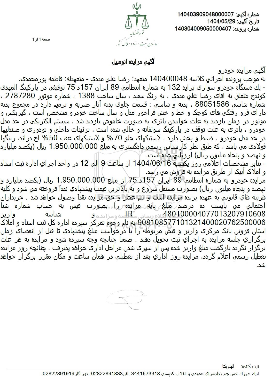 مزایده عمومی مزایده فروش خودرو سواری پراید 132 رنگ سفید مدل 1388 برگزار میگردد. از کلیه افراد متخصص و شرکتهای واجد شرایط دعوت به عمل میآید تا در این مزایده با کد خبرگزاری پارس نماد : 9441872 شرکت نمایند تاریخ شروع مزایده : 1404/05/30 مهلت شرکت در مزایده: تا پایان روز 1404/06/16 مکان برگزاری اموال واگذاری استانهای قزوین و دستهبندیهای مربوط به این حراجی انواع خودرو سبک میباشد.