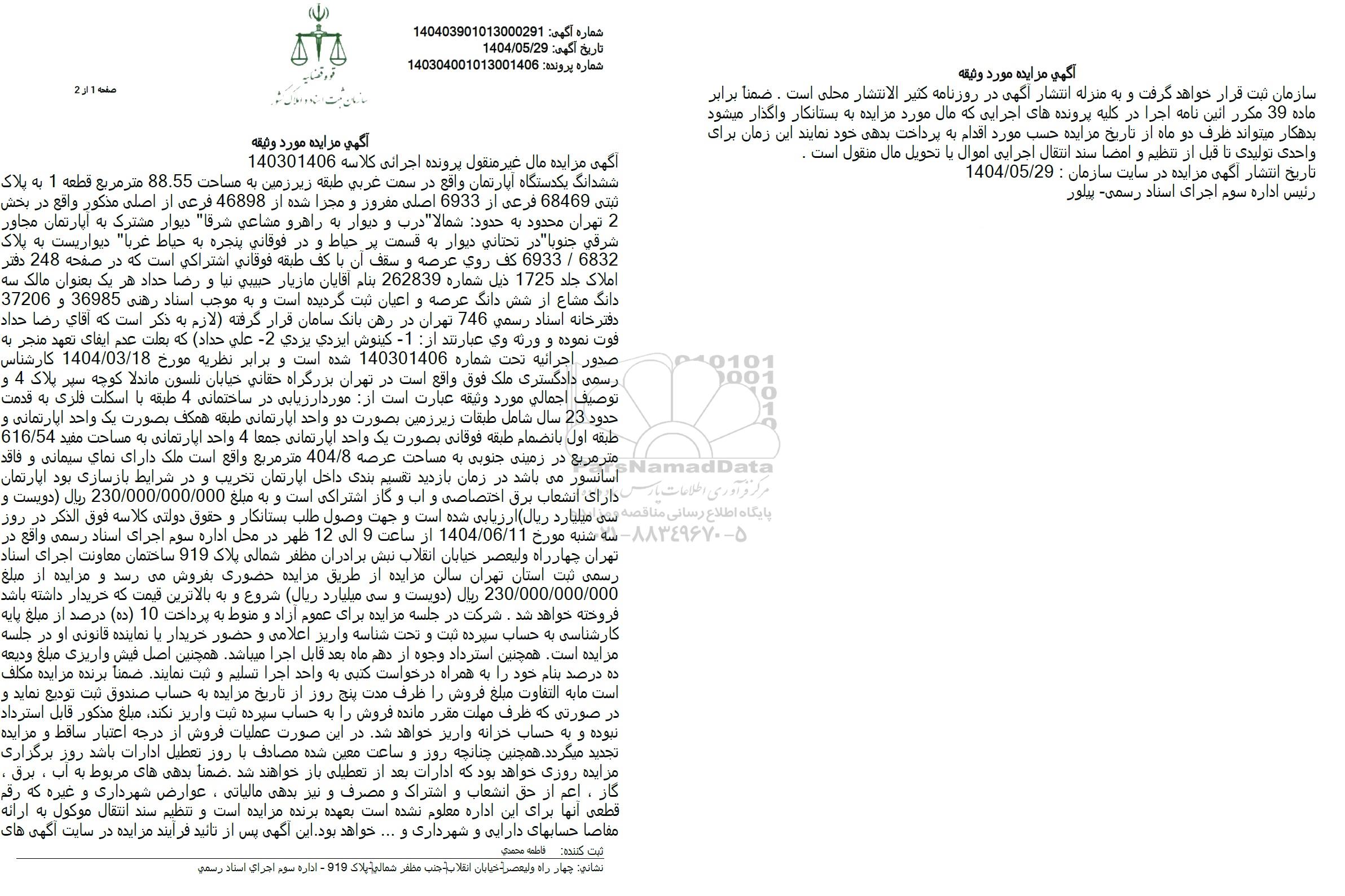 مزایده فروش یکدستگاه آپارتمان به مساحت 88.55 مترمربع به پلاحک 68469 فرعی از 6933 اصلی