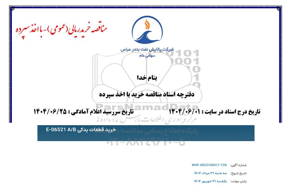 مناقصه خرید قطعات یدکی E-06521 A/B از کلیه افراد متخصص و شرکتها واجد شرایط دعوت به عمل میآید در مناقصه با کد خبرگزاری پارس نماد: 9441978 شرکت نمایند.