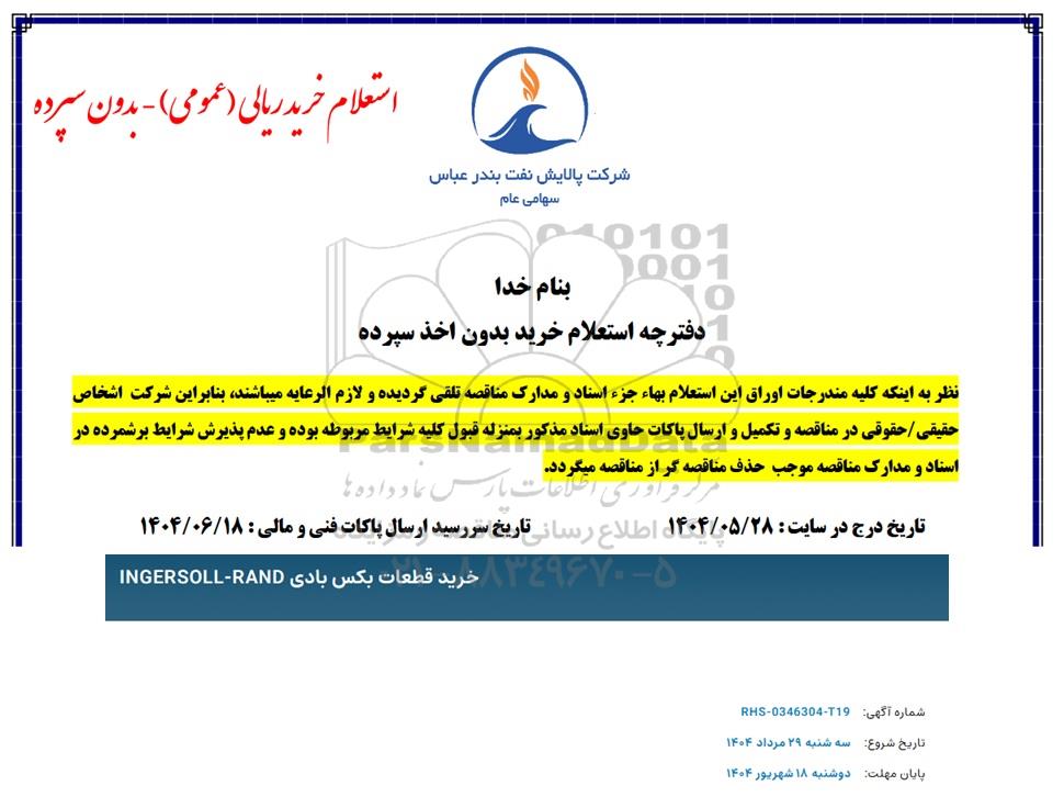 استعلام خرید قطعات بکس بادی INGERSOLL - RAND, استعلام خرید قطعات بکس بادی INGERSOLL - RAND
