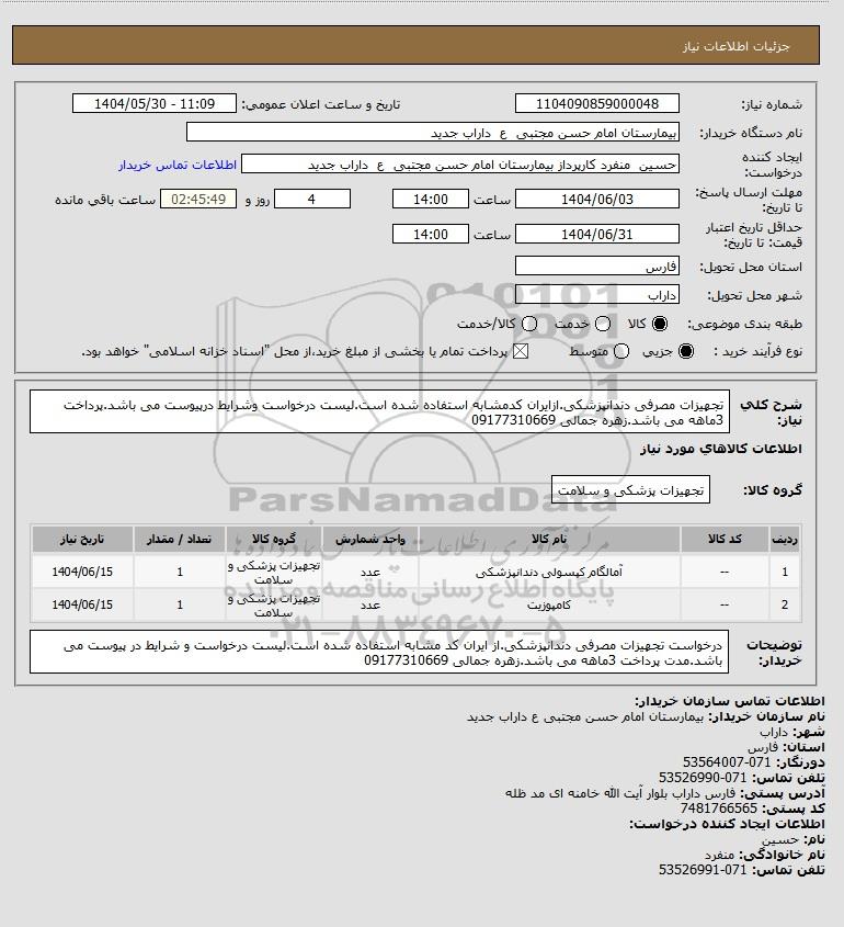 دانلود اسناد مناقصهاستعلام بها و موضوع استعلام استعلام تجهیزات مصرفی دندانپزشکی.ازایران کدمشابه استفاده شده است.لیست درخواست وشرایط درپیوست می باشد.پرداخت 3ماهه می باشد.زهره جمالی 09177310669 به اطلاع کلیه شرکتها و افراد متخصص واجد شرایط میرساند، آگهی گذار در نظر دارد از طریق استعلام بها، نسبت به انتخاب و دریافت پیشنهادات اقدام نماید. این استعلام با کد آگهی ثبت شده در سامانه خبرگزاری پارس نماد : 9442279 منتشر شده است. مشخصات استعلام : تاریخ شروع استعلام: 1404/05/30 آخرین مهلت ارسال پیشنهاد قیمت : 1404/06/03 و محل اجرای پروژه : استان فارس میباشد. استعلام قیمت مورد درخواست : استعلام تجهیزات مصرفی دندانپزشکی.ازایران کدمشابه استفاده شده است.لیست درخواست وشرایط درپیوست می باشد.پرداخت 3ماهه می باشد.زهره جمالی 09177310669 با دستهبندیهای تخصصی و گروه های مرتبط : خدمات و تجهیزات آزمایشگاهی و پزشکی, استعلام اطلاع رسانی میگردد. شرایط شرکت در استعلام آنلاین : ابتدا ثبت نام در سامانه استعلام پارس نماد و تکمیل مدارک موردنیاز و بارگذاری در سامانه رعایت تمامی ضوابط و الزامات مندرج در اسناد استعلام است.
