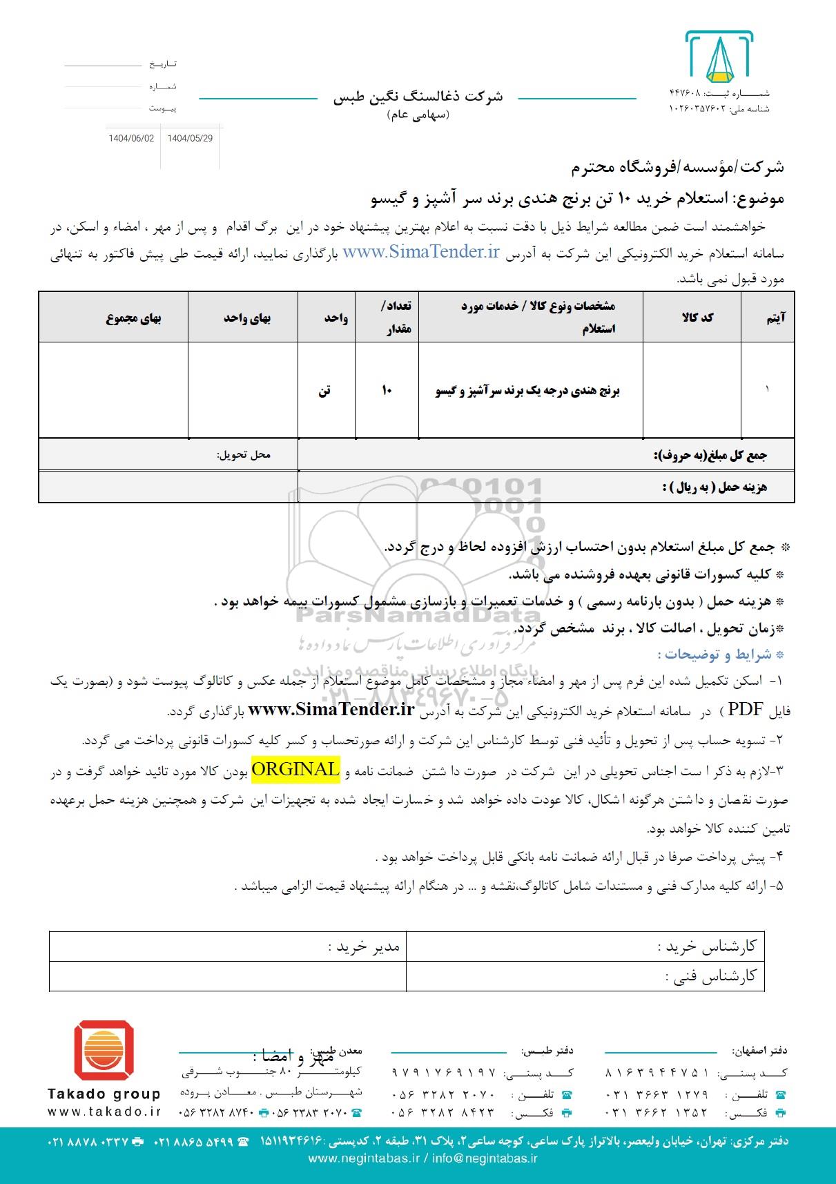 خواهشمند است ضمن مطالعه شرایط ذیل با دقت نسبت به اعلام بهترین پیشنهاد خود در این برگ اقدام و پس از مهر، امضا و اسکن در سامانه استعلام خرید الکترونیکی این شرکت به آدرس www.simaTender.ir بارگذاری نمایید ارایه قیمت طی پیش فاکتور به تنهایی مورد قبول نمی باشد.