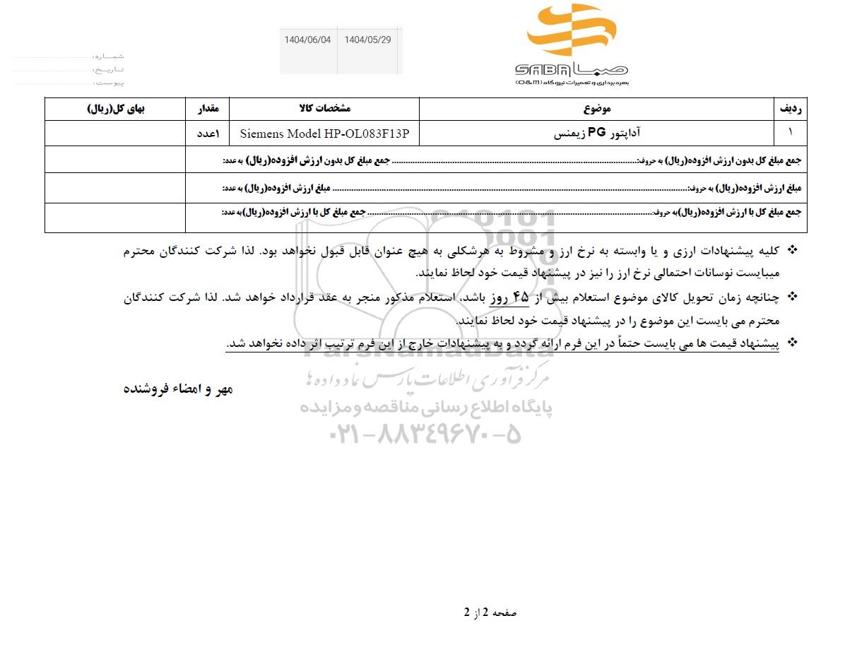استعلام بها و موضوع استعلام استعلام آداپتور PG زیمنس به اطلاع کلیه شرکتها و افراد متخصص واجد شرایط میرساند، آگهی گذار در نظر دارد از طریق استعلام بها، نسبت به انتخاب و دریافت پیشنهادات اقدام نماید. این استعلام با کد آگهی ثبت شده در سامانه خبرگزاری پارس نماد : 9442382 منتشر شده است. مشخصات استعلام : تاریخ شروع استعلام: 1404/05/30 آخرین مهلت ارسال پیشنهاد قیمت : 1404/06/04 و محل اجرای پروژه : استان سایر میباشد. استعلام قیمت مورد درخواست : استعلام آداپتور PG زیمنس با دستهبندیهای تخصصی و گروه های مرتبط : منابع تغذیه, نیروگاه, تجهیزات برق و الکترونیک, استعلام اطلاع رسانی میگردد. شرایط شرکت در استعلام آنلاین : ابتدا ثبت نام در سامانه استعلام پارس نماد و تکمیل مدارک موردنیاز و بارگذاری در سامانه رعایت تمامی ضوابط و الزامات مندرج در اسناد استعلام است.