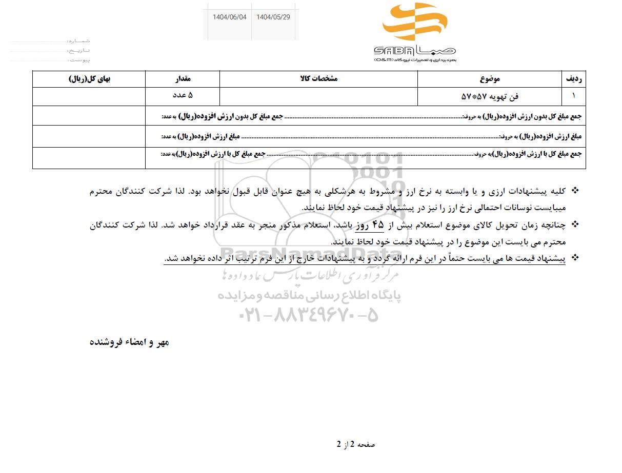 استعلام بها و موضوع استعلام استعلام فن تهویه 57 * 57 به اطلاع کلیه شرکتها و افراد متخصص واجد شرایط میرساند، آگهی گذار در نظر دارد از طریق استعلام بها، نسبت به انتخاب و دریافت پیشنهادات اقدام نماید. این استعلام با کد آگهی ثبت شده در سامانه خبرگزاری پارس نماد : 9442386 منتشر شده است. مشخصات استعلام : تاریخ شروع استعلام: 1404/05/30 آخرین مهلت ارسال پیشنهاد قیمت : 1404/06/04 و محل اجرای پروژه : استان سایر میباشد. استعلام قیمت مورد درخواست : استعلام فن تهویه 57 * 57 با دستهبندیهای تخصصی و گروه های مرتبط : تاسیسات ساختمانی, صنایع حرارتی و برودتی, سیستم تهویه و هواکشی صنعتی, استعلام اطلاع رسانی میگردد. شرایط شرکت در استعلام آنلاین : ابتدا ثبت نام در سامانه استعلام پارس نماد و تکمیل مدارک موردنیاز و بارگذاری در سامانه رعایت تمامی ضوابط و الزامات مندرج در اسناد استعلام است.