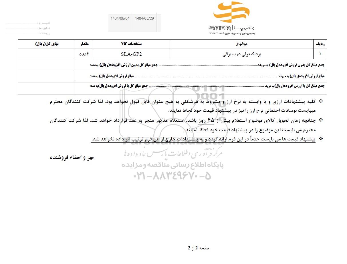 استعلام بها و موضوع استعلام استعلام برد کنترلی درب برقی به اطلاع کلیه شرکتها و افراد متخصص واجد شرایط میرساند، آگهی گذار در نظر دارد از طریق استعلام بها، نسبت به انتخاب و دریافت پیشنهادات اقدام نماید. این استعلام با کد آگهی ثبت شده در سامانه خبرگزاری پارس نماد : 9442396 منتشر شده است. مشخصات استعلام : تاریخ شروع استعلام: 1404/05/29 آخرین مهلت ارسال پیشنهاد قیمت : 1404/06/04 و محل اجرای پروژه : استان سایر میباشد. استعلام قیمت مورد درخواست : استعلام برد کنترلی درب برقی با دستهبندیهای تخصصی و گروه های مرتبط : انواع در و پنجره, انواع تابلو و راکهای مخابراتی و برقی, سیستم های حفاظتی-دوربین مدار بسته،دزدگیر،آیفون تصویری و آنتن مرکزی, درب های اتوماتیک و سیستم های کنترل تردد, اتوماسیون ، مراکز کنترل صنعتی, تجهیزات برق و الکترونیک, استعلام اطلاع رسانی میگردد. شرایط شرکت در استعلام آنلاین : ابتدا ثبت نام در سامانه استعلام پارس نماد و تکمیل مدارک موردنیاز و بارگذاری در سامانه رعایت تمامی ضوابط و الزامات مندرج در اسناد استعلام است.