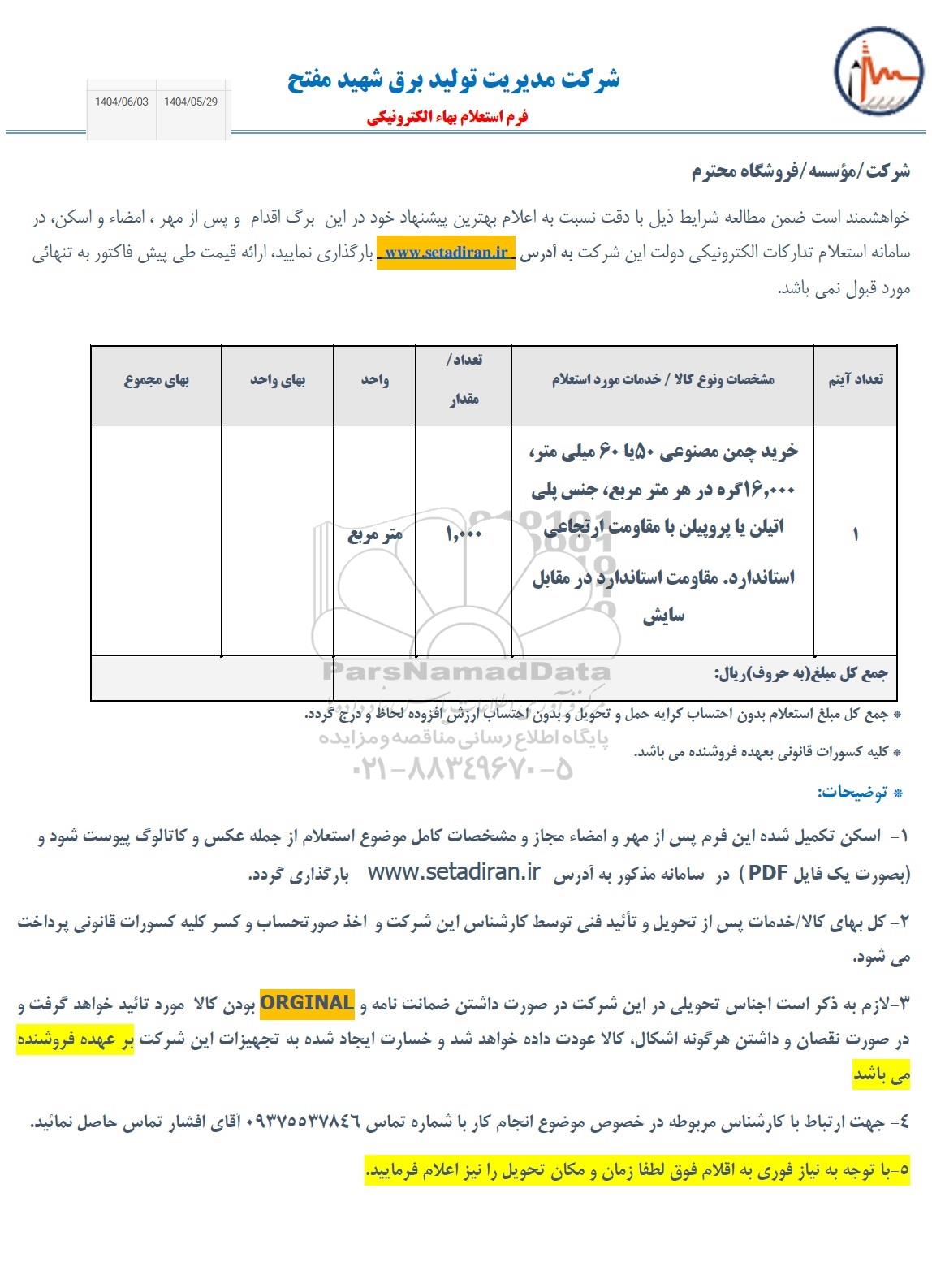نحوه دریافت اسناد و ارسال پیشنهاد: متقاضیان می‌توانند با ثبت نام در سامانه مناقصات و مزایدات ایران (پارس نماد) نسبت به مشاهده اسناد استعلام، دریافت اطلاعات تکمیلی، و ثبت پیشنهاد قیمت خود اقدام نمایند. در صورت نیاز به دریافت راهنمایی یا پشتیبانی در خصوص استعلام و مناقصه و فراخوان مناقصه عمومی، مناقصه محدود، مناقصه بین‌ المللی، مناقصه دولتی، مناقصه خصوصی، مناقصه آنلاین فروش تجهیزات، مناقصه مشاوره‌ای مناقصه پتروشیمی و انرژی مناقصه صنایع و تجهیزات برق و مخابرات و نفت و گاز ... لطفاً با سایت خبری مناقصه و مزایده پارس‌نماد داده‌ها به شماره 88349670 تماس حاصل فرمایید.