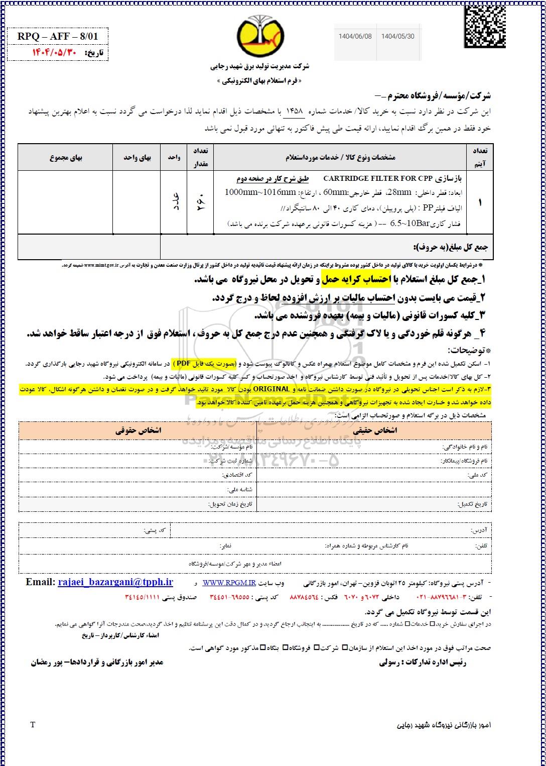 استعلام بازسازی CARTRIDGE FILTER FOR CPP ..., استعلام بازسازی CARTRIDGE FILTER FOR CPP ...