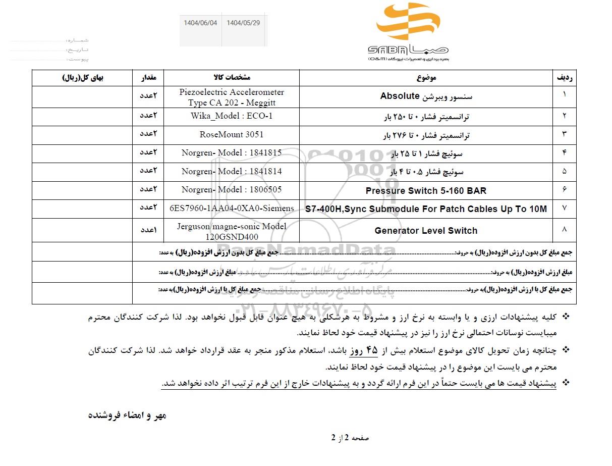 نحوه دریافت اسناد و ارسال پیشنهاد: متقاضیان می‌توانند با ثبت نام در سامانه مناقصات و مزایدات ایران (پارس نماد) نسبت به مشاهده اسناد استعلام، دریافت اطلاعات تکمیلی، و ثبت پیشنهاد قیمت خود اقدام نمایند. در صورت نیاز به دریافت راهنمایی یا پشتیبانی در خصوص استعلام و مناقصه و فراخوان مناقصه عمومی، مناقصه محدود، مناقصه بین‌ المللی، مناقصه دولتی، مناقصه خصوصی، مناقصه آنلاین فروش تجهیزات، مناقصه مشاوره‌ای مناقصه پتروشیمی و انرژی مناقصه صنایع و تجهیزات برق و مخابرات و نفت و گاز ... لطفاً با سایت خبری مناقصه و مزایده پارس‌نماد داده‌ها به شماره 88349670 تماس حاصل فرمایید.