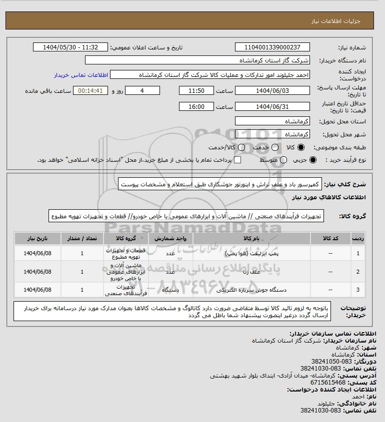 شرح کلی نیاز: کمپرسور باد و علف تراش و اینورتور جوشکاری طبق استعلام و مشخصات پیوست