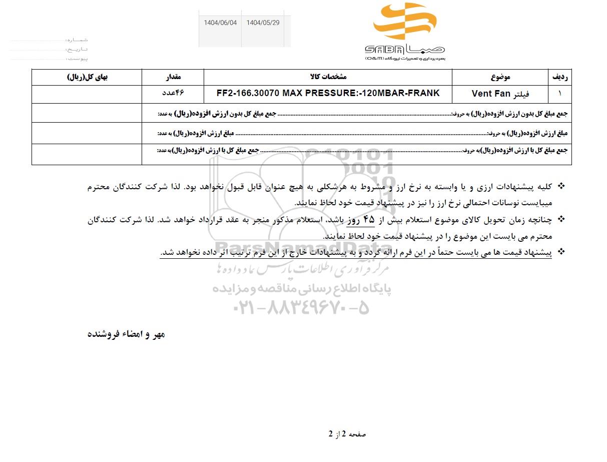 استعلام بها و موضوع استعلام استعلام فیلتر Ven Fan  به اطلاع کلیه شرکت‌ها و افراد متخصص واجد شرایط می‌رساند، آگهی گذار در نظر دارد از طریق استعلام بها، نسبت به انتخاب و دریافت پیشنهادات اقدام نماید. این استعلام با کد آگهی ثبت شده در سامانه خبرگزاری پارس نماد : 9442468 منتشر شده است. مشخصات استعلام : تاریخ شروع استعلام: 1404/05/29 آخرین مهلت ارسال پیشنهاد قیمت : 1404/06/04 و محل اجرای پروژه : استان سایر میباشد. استعلام قیمت مورد درخواست : استعلام فیلتر Ven Fan  با دسته‌بندی‌های تخصصی و گروه های مرتبط : انواع فیلتر های تصفیه, تاسیسات ساختمانی, صنایع حرارتی و برودتی, سیستم تهویه و هواکشی صنعتی, نیروگاه, تجهیزات برق و الکترونیک, استعلام اطلاع رسانی میگردد. شرایط شرکت در استعلام آنلاین : ابتدا ثبت نام در سامانه استعلام پارس نماد و تکمیل مدارک موردنیاز و بارگذاری در سامانه رعایت تمامی ضوابط و الزامات مندرج در اسناد استعلام است.