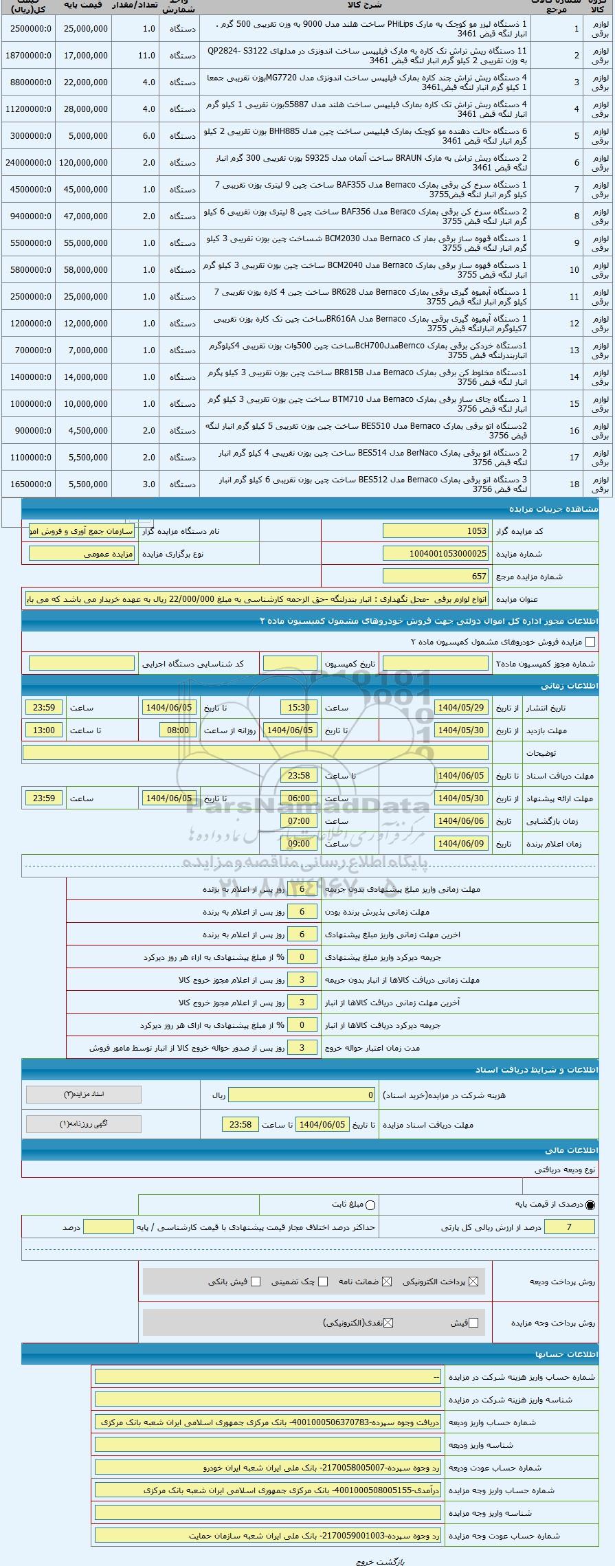 لوازم برقی | 15 | 1 دستگاه چای ساز برقی بمارک Bernaco مدل BTM710 ساخت چین بوزن تقریبی 3 کیلو گرم انبار لنگه قبض 3756 | دستگاه | 1.0 | 10,000,000 | 1000000:0 |