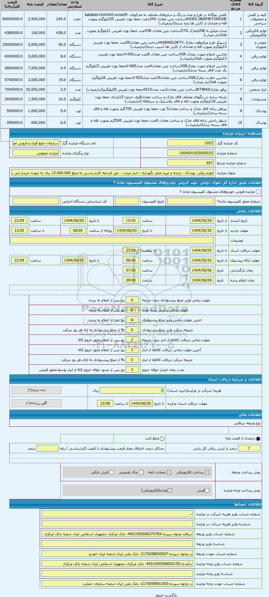 عنوان مزایده | لوازم برقی- پوشاک - پارچه و غیره محل نگهداری : انبار میناب - حق الزحمه کارشناسی به مبلغ 15.000.000 ریال به عهده خریدار می باشد که می بایست به حساب کانون کارشناسان واریز گردد. |