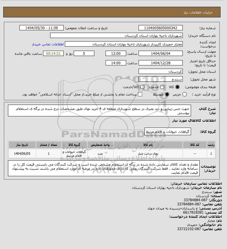 شرح کلی نیاز: جهت حس زیبایی و دید بصری در سطح شهرداری منطقه ی 4 خرید نهال طبق مشخصات درج شده در برگه ی استعلام پیوستی