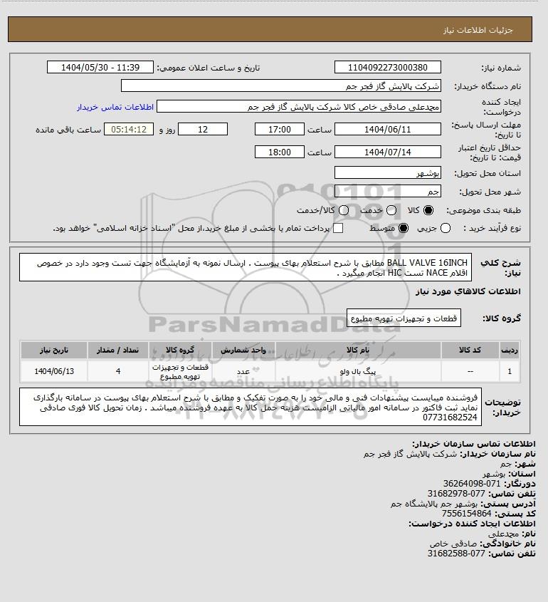 شرح کلی نیاز: BALL VALVE 16INCH مطابق با شرح استعلام بهای پیوست . ارسال نمونه به آزمایشگاه جهت تست وجود دارد در خصوص اقلام NACE تست HIC انجام میگیرد .