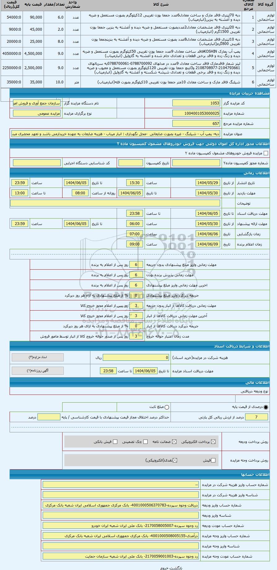 9 مزایده عمومی فروش اقلام ضایعاتی و مازاد شامل... 9645837 1404/07/13 new not special not payed تهران