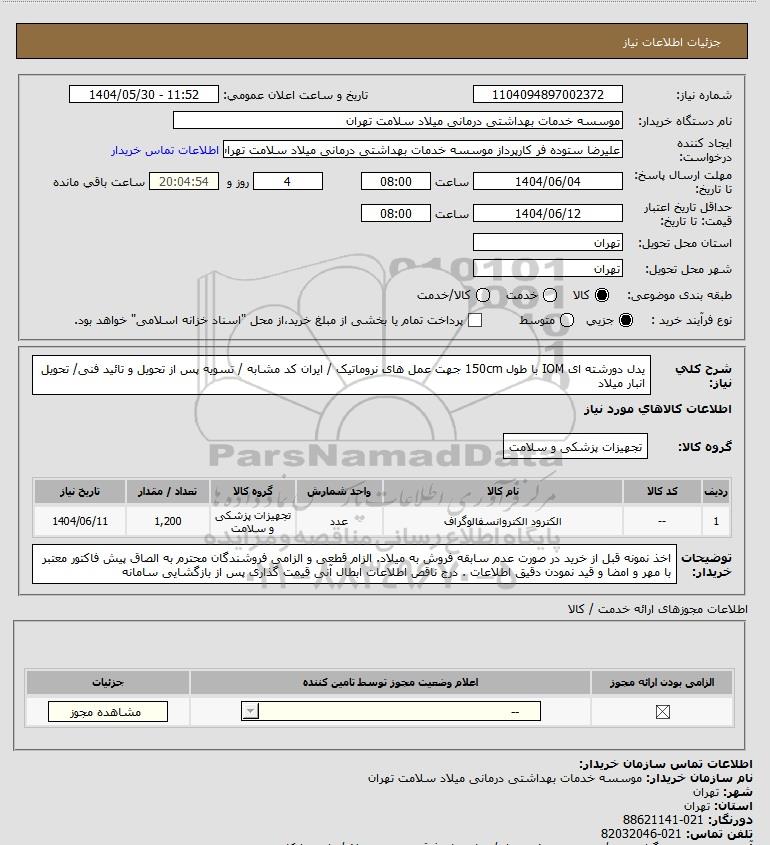 شرح کلی نیاز: یدل دورشته ای IOM با طول 150cm جهت عمل های نروماتیک / ایران کد مشابه / تسویه پس از تحویل و تائید فنی/ تحویل انبار میلاد