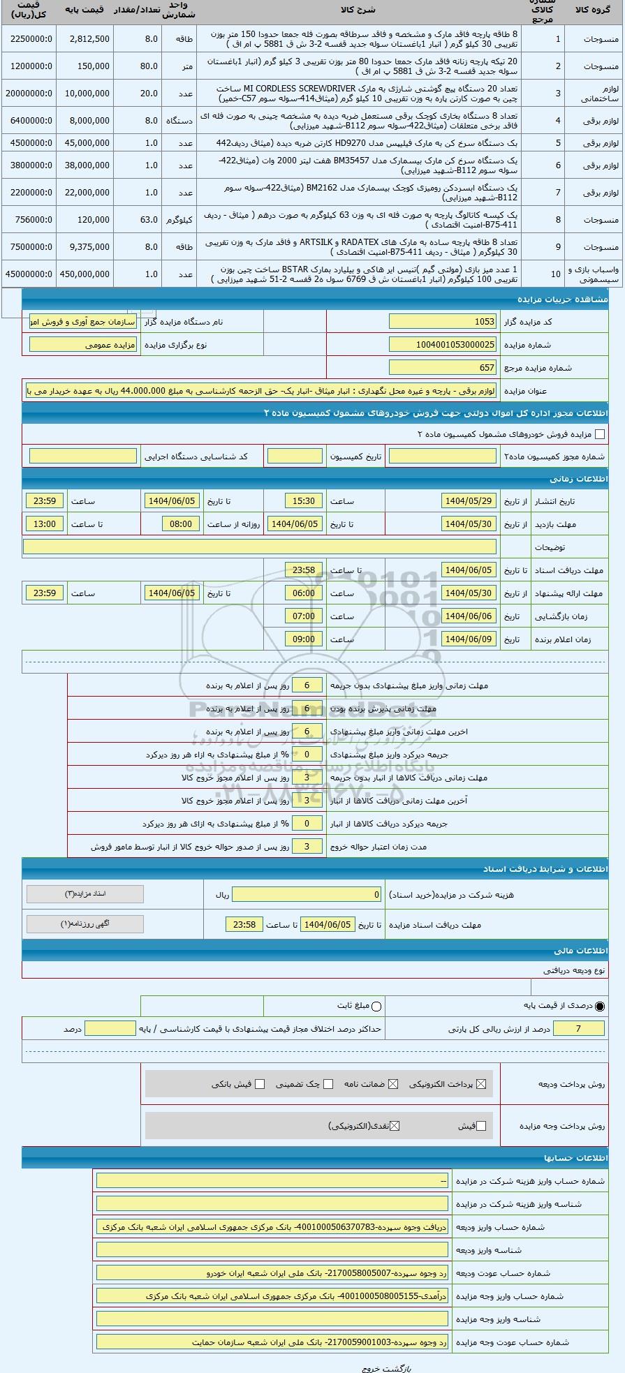 مزایده لوازم برقی - پارچه و غیره محل نگهداری : انبار میثاق -انبار یک- حق الزحمه کارشناسی به مبلغ 44.000.000 ریال به عهده خریدا, مزایده ، لوازم برقی - پارچه و غیره محل نگهداری : انبار میثاق -انبار یک- حق الزحمه کارشناسی به مبلغ 44.000.000 ریال به عهده خریدا