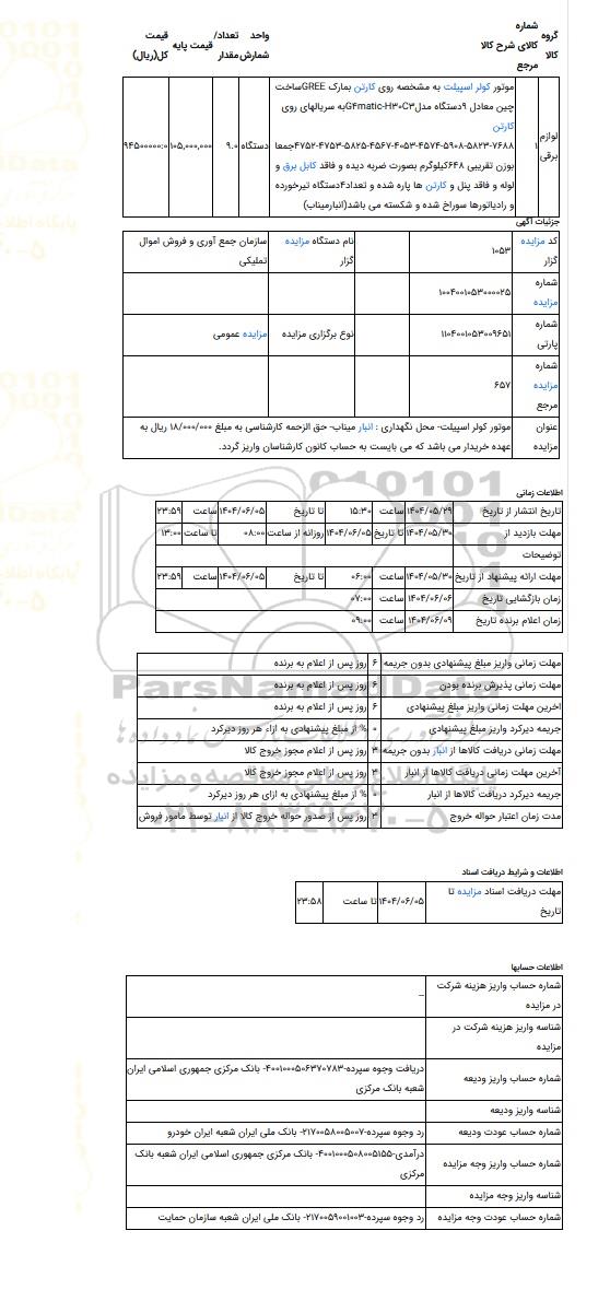 لوازم برقی | 1 | موتور کولر اسپیلت به مشخصه روی کارتن بمارک GREEساخت چین معادل 9دستگاه مدلG4matic-H30C3به سریالهای روی کارتن 7688-5823-5908-4574-4053-4567-5825-4753-4752جمعا بوزن تقریبی 648کیلوگرم بصورت ضربه دیده و فاقد کابل برق و لوله و فاقد پنل و کارتن ها پاره شده و تعداد4دستگاه تیرخورده و رادیاتورها سوراخ شده و شکسته می باشد(انبارمیناب) | دستگاه | 9.0 | 105,000,000 | 94500000:0 |