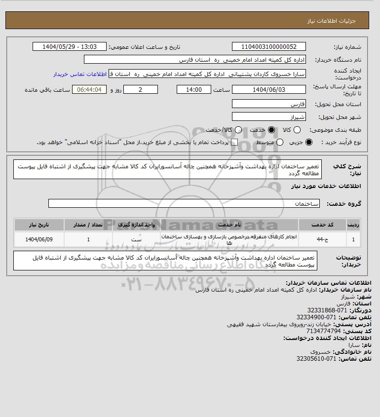 شرح کلی نیاز: تعمیر ساختمان اداره بهداشت وآشپزخانه همچنین چاله آسانسورایران کد کالا مشابه جهت پیشگیری از اشتباه فایل پیوست مطالعه گردد