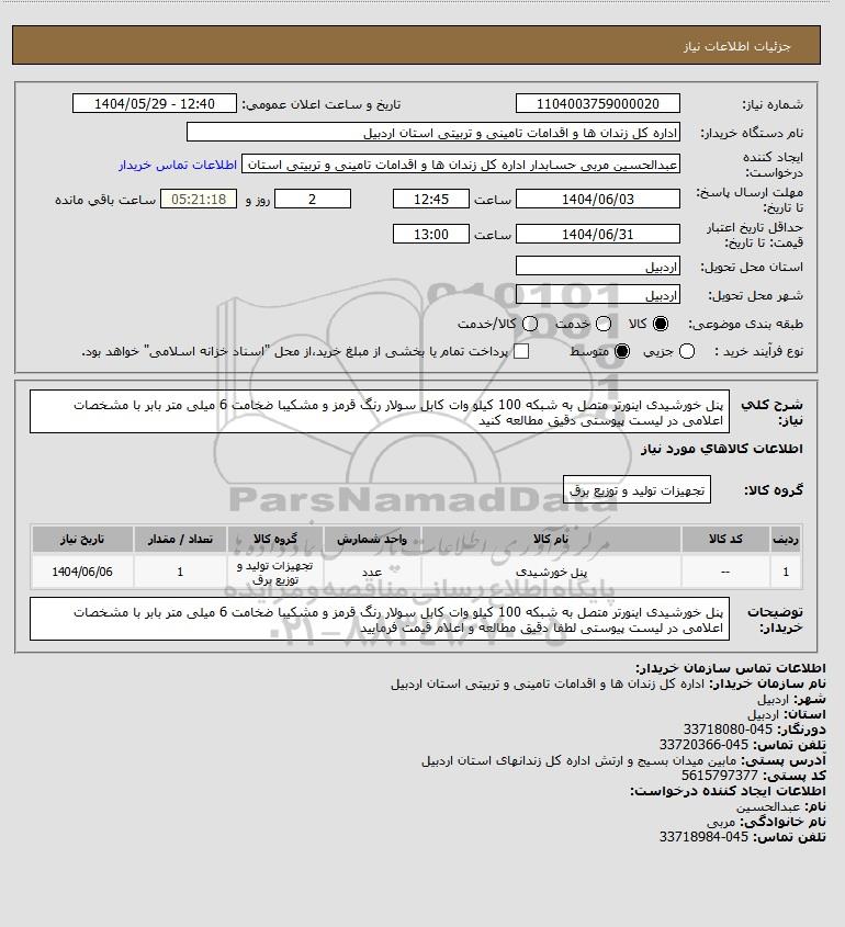 | 1 | -- | پنل خورشیدی | عدد | تجهیزات تولید و توزیع برق | 1 | 1404/06/06 |