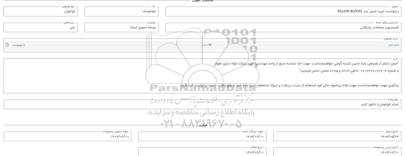 دانلود اسناد مناقصهاستعلام بها و موضوع استعلام فراخوان، استعلام خرید شش عدد PILLOW BLOCKS به اطلاع کلیه شرکتها و افراد متخصص واجد شرایط میرساند، آگهی گذار در نظر دارد از طریق استعلام بها، نسبت به انتخاب و دریافت پیشنهادات اقدام نماید. این استعلام با کد آگهی ثبت شده در سامانه خبرگزاری پارس نماد : 9443393 منتشر شده است. مشخصات استعلام : تاریخ شروع استعلام: 1404/05/29 آخرین مهلت ارسال پیشنهاد قیمت : 1404/06/10 و محل اجرای پروژه : استان خوزستان میباشد. استعلام قیمت مورد درخواست : فراخوان، استعلام خرید شش عدد PILLOW BLOCKS با دستهبندیهای تخصصی و گروه های مرتبط : ماشین کاری, تجهیزات و ماشین آلات صنعتی, خطوط انتقال مواد ، نوارنقاله, استعلام اطلاع رسانی میگردد. شرایط شرکت در استعلام آنلاین : ابتدا ثبت نام در سامانه استعلام پارس نماد و تکمیل مدارک موردنیاز و بارگذاری در سامانه رعایت تمامی ضوابط و الزامات مندرج در اسناد استعلام است.