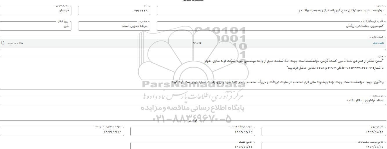 تاریخ شروع: 1404.05.26 - مهلت دریافت اسناد: 1404.06.10 - مهلت تحویل پیشنهادات: 1404.06.10