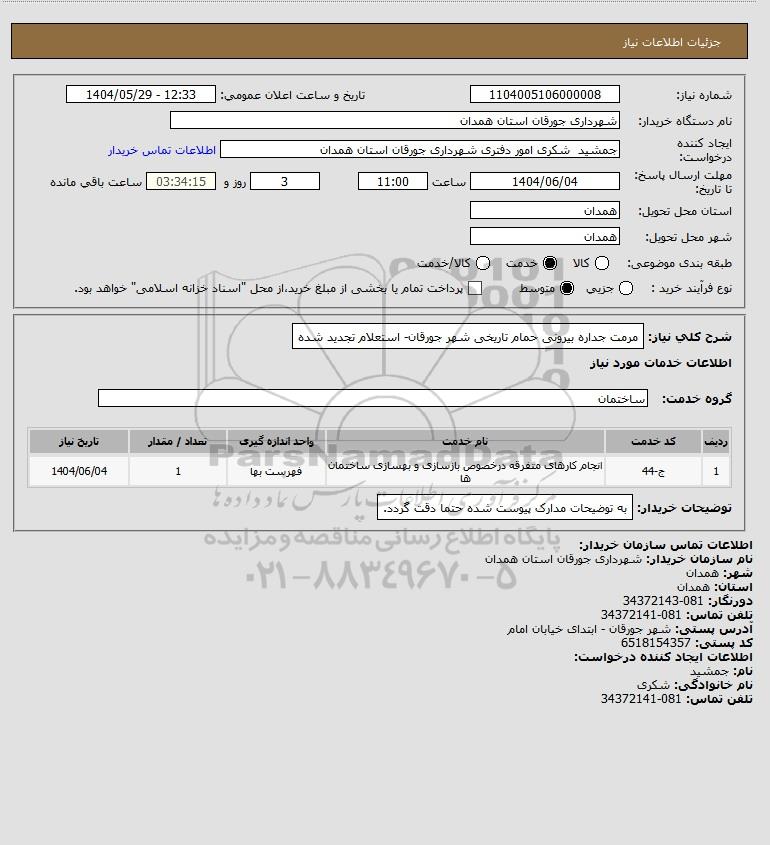 شرح کلی نیاز: مرمت جداره بیرونی حمام تاریخی شهر جورقان- استعلام تجدید شده