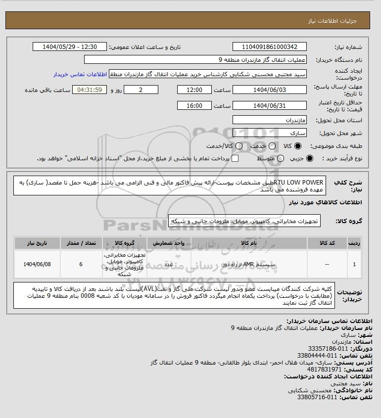 شرح کلی نیاز: RTU LOW POWERطبق مشخصات پیوست-ارائه پیش فاکتور مالی و فنی الزامی می باشد -هزینه حمل تا مقصد( ساری) به عهده فروشنده می باشد