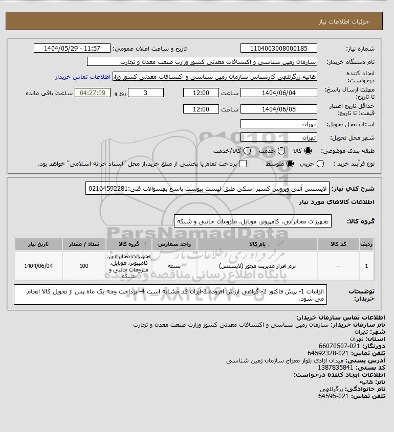 | 1 | -- | نرم افزار مدیریت مجوز (لایسنس) | بسته | تجهیزات مخابراتی، کامپیوتر، موبایل، ملزومات جانبی و شبکه | 100 | 1404/06/04 |