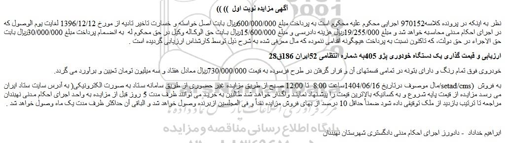 مزایده یک دستگاه خودوری پژو 405, مزایده یک دستگاه خودوری پژو 405