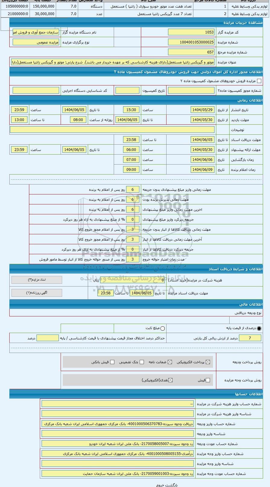 | کد مزایده گزار | 1053 | نام دستگاه مزایده گزار | سازمان جمع آوری و فروش اموال تملیکی | |