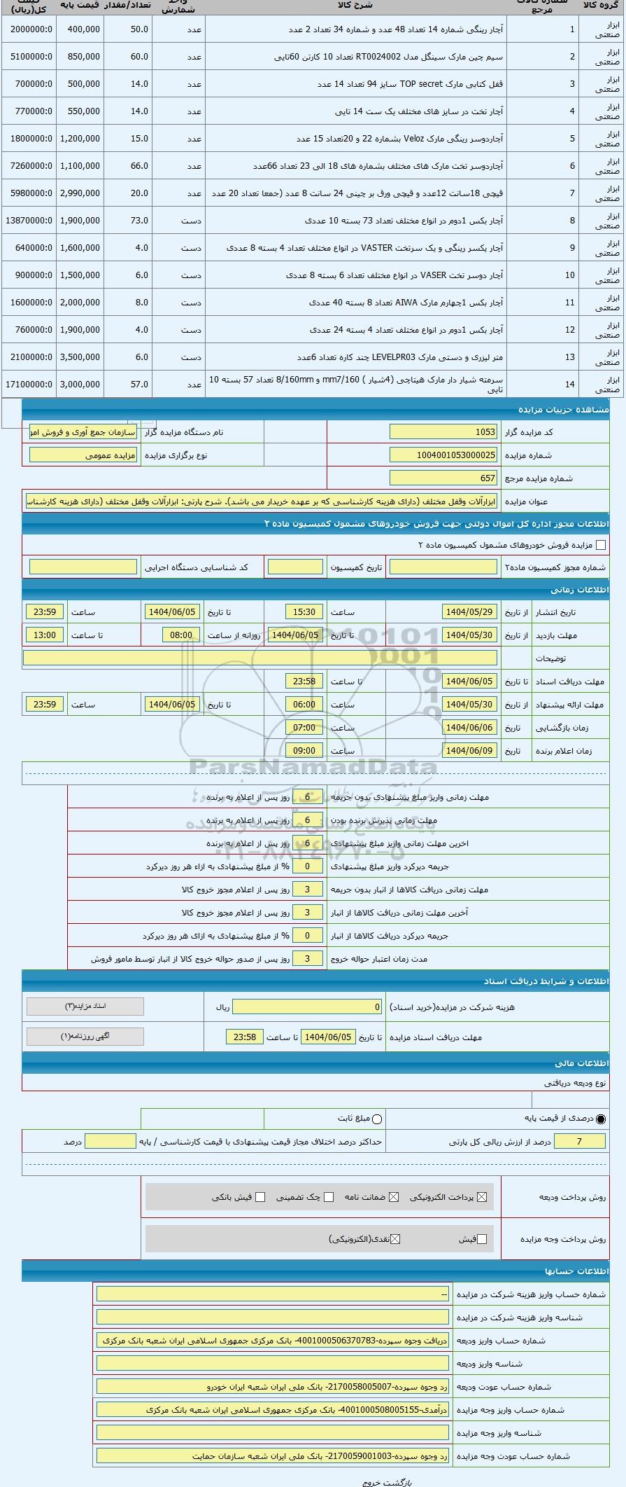 مزایده عمومی مزایده ابزارآلات وقفل مختلف (دارای هزینه کارشناسی که بر عهده خریدار می باشد) برگزار میگردد. از کلیه افراد متخصص و شرکت‌های واجد شرایط دعوت به عمل می‌آید تا در این مزایده با کد خبرگزاری پارس نماد : 9443925 شرکت نمایند تاریخ شروع مزایده : 1404/05/29 مهلت شرکت در مزایده: تا پایان روز 1404/06/05 مکان برگزاری اموال واگذاری استان‌های کرمان و دسته‌بندی‌های مربوط به این حراجی ابزار و یراق آلات, تجهیزات کارخانه ها و ماشین آلات صنعتی میباشد.