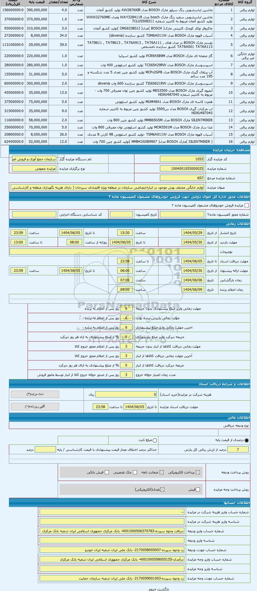 | عنوان مزایده | لوازم خانگی مختلف بوش موجود در انباراختصاصی سازمان در منطقه ویژه اقتصادی سیرجان ( دارای هزینه نگهداری منطقه و کارشناسی که بر عهده خریدار می باشد) | |||
