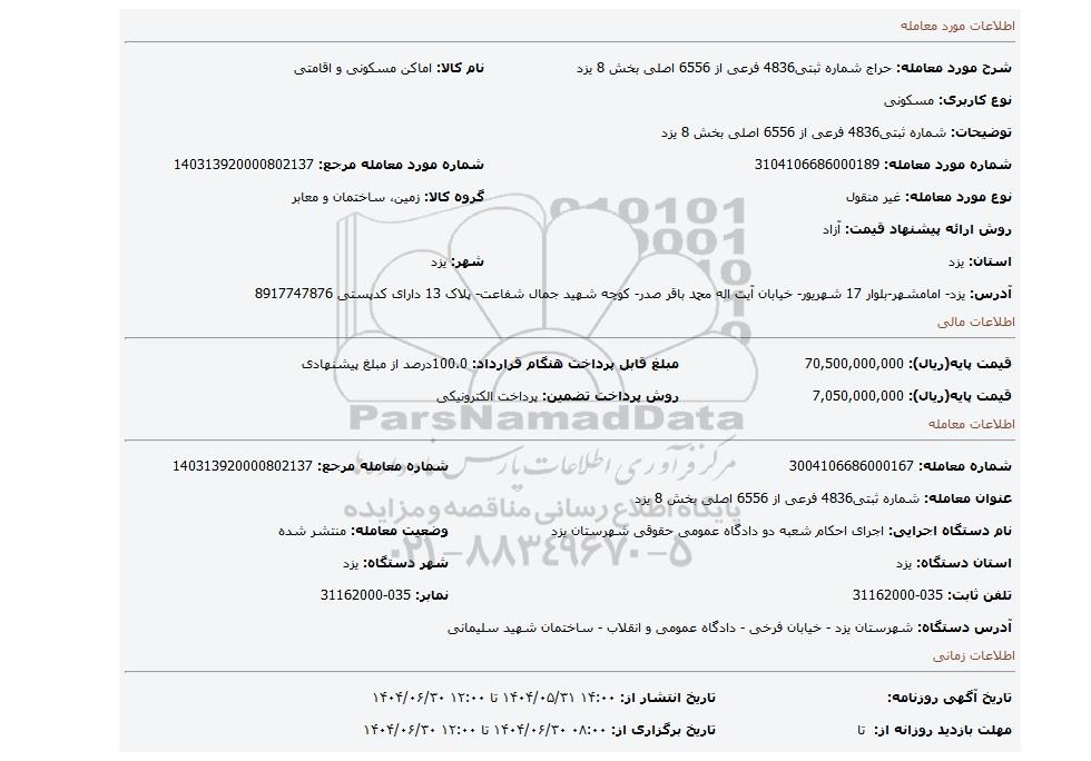 | شرح مورد معامله: حراج شماره ثبتی4836 فرعی از 6556 اصلی بخش 8 یزد | نام کالا: اماکن مسکونی و اقامتی | |