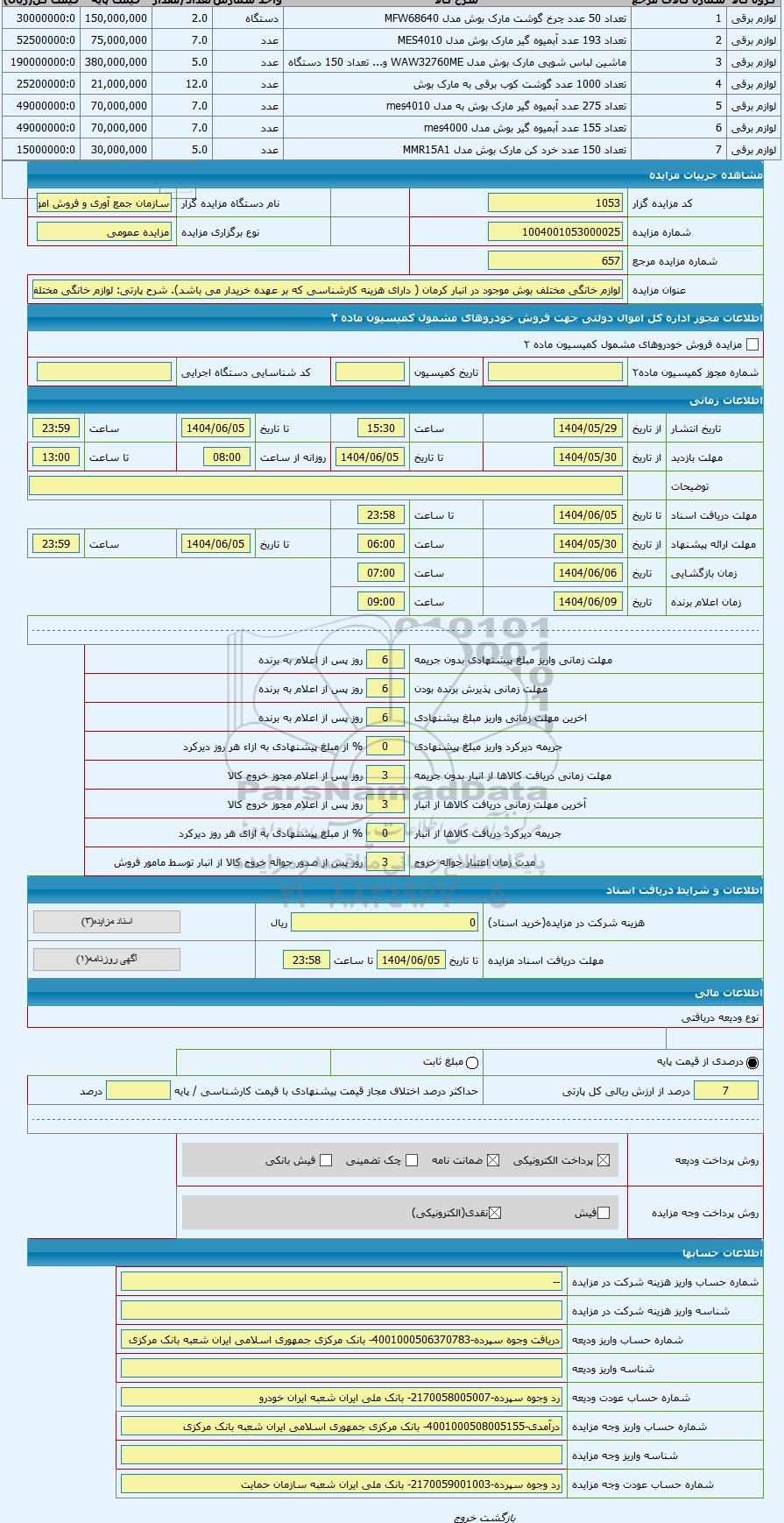 مزایده عمومی مزایده لوازم خانگی مختلف بوش موجود در انبار کرمان ( دارای هزینه کارشناسی که بر عهده خریدار می باشد) برگزار میگردد. از کلیه افراد متخصص و شرکت‌های واجد شرایط دعوت به عمل می‌آید تا در این مزایده با کد خبرگزاری پارس نماد : 9444241 شرکت نمایند تاریخ شروع مزایده : 1404/05/29 مهلت شرکت در مزایده: تا پایان روز 1404/06/05 مکان برگزاری اموال واگذاری استان‌های کرمان و دسته‌بندی‌های مربوط به این حراجی متفرقه میباشد.