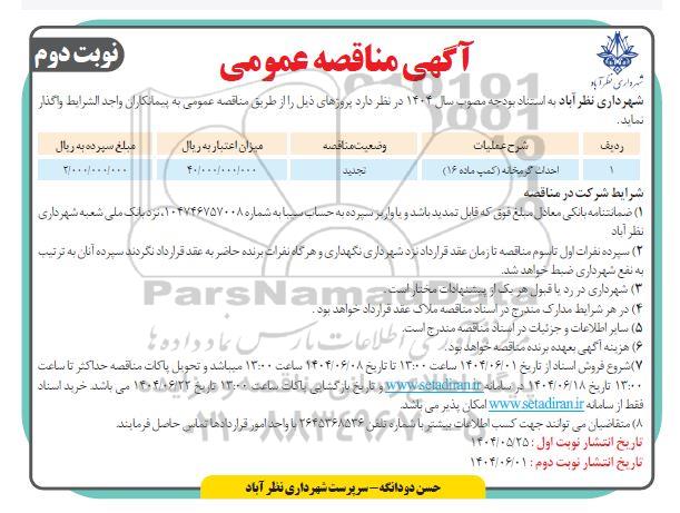 شهرداری نظر آباد به استناد بودجه مصوب سال 1404 در نظر دارد پروژهای ذیل را از طریق مناقصه عمومی به پیمانکاران واجد الشرایط واگذار نماید.