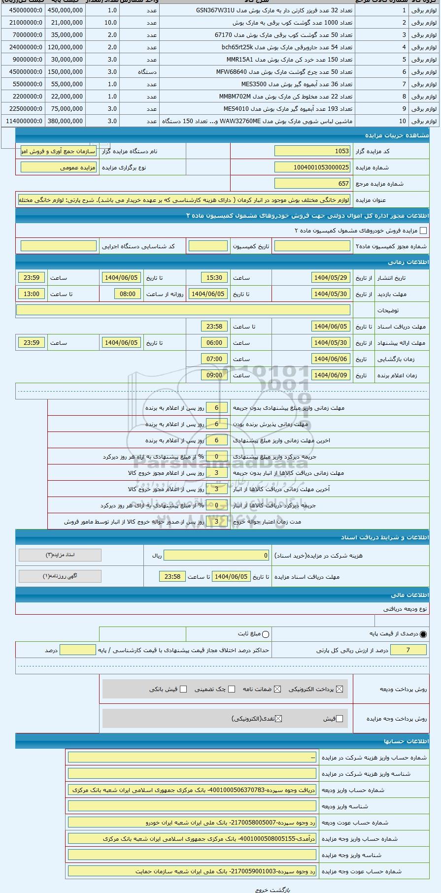 عنوان مزایدهلوازم خانگی مختلف بوش موجود در انبار کرمان ( دارای هزینه کارشناسی که بر عهده خریدار می باشد)