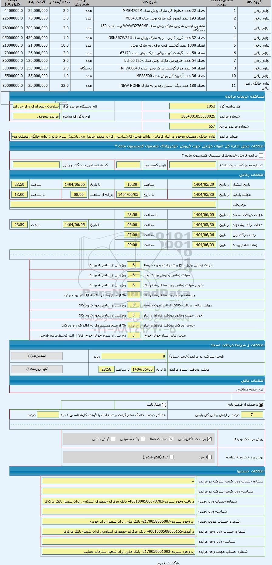 | لوازم برقی | 4 | تعداد 32 عدد فریزر کارتن دار به مارک بوش مدل GSN367W31U | عدد | 1.0 | 450,000,000 | 45000000:0 |